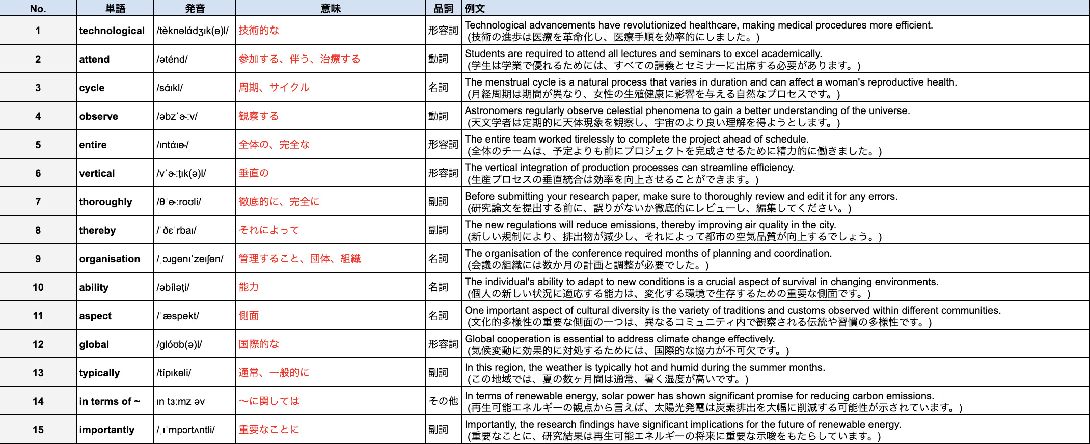 公式問題集を1から分析し頻出単語を出る順で編集。リスニング、アカデミックリーディング、ジェネラルリーディングに分けて必要な単語をピンポイントで学習。
